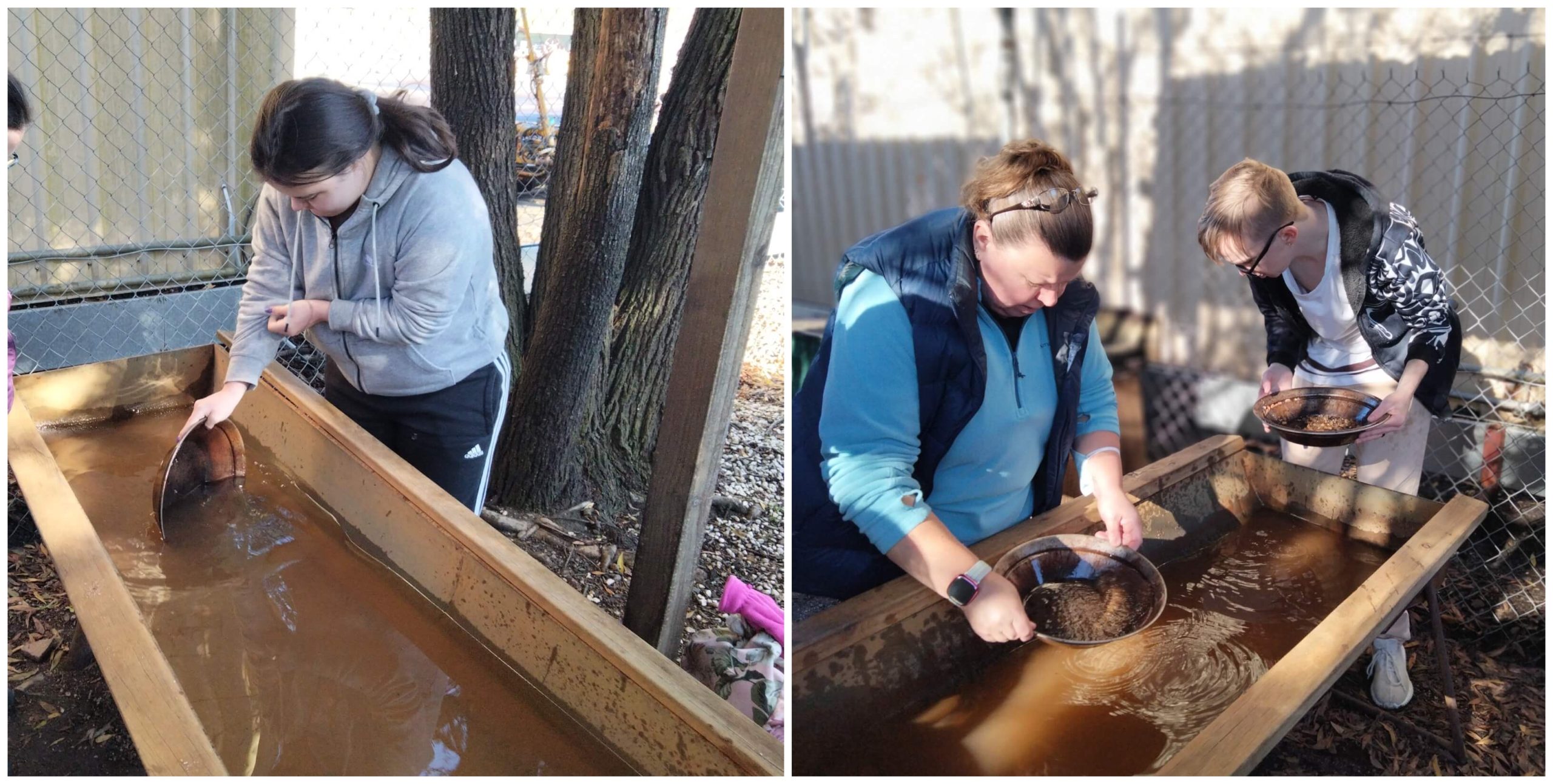 Image Description: the first photo is of Colby panning for gold as she dips a pan in a trough. She is wearing black pants and a grey zip-up jacket. The second photo is of Coby and a staff member panning for gold in the trough. Coby is wearing white runners, beige pants, a white t-shirt and a black and white zip-up jacket.