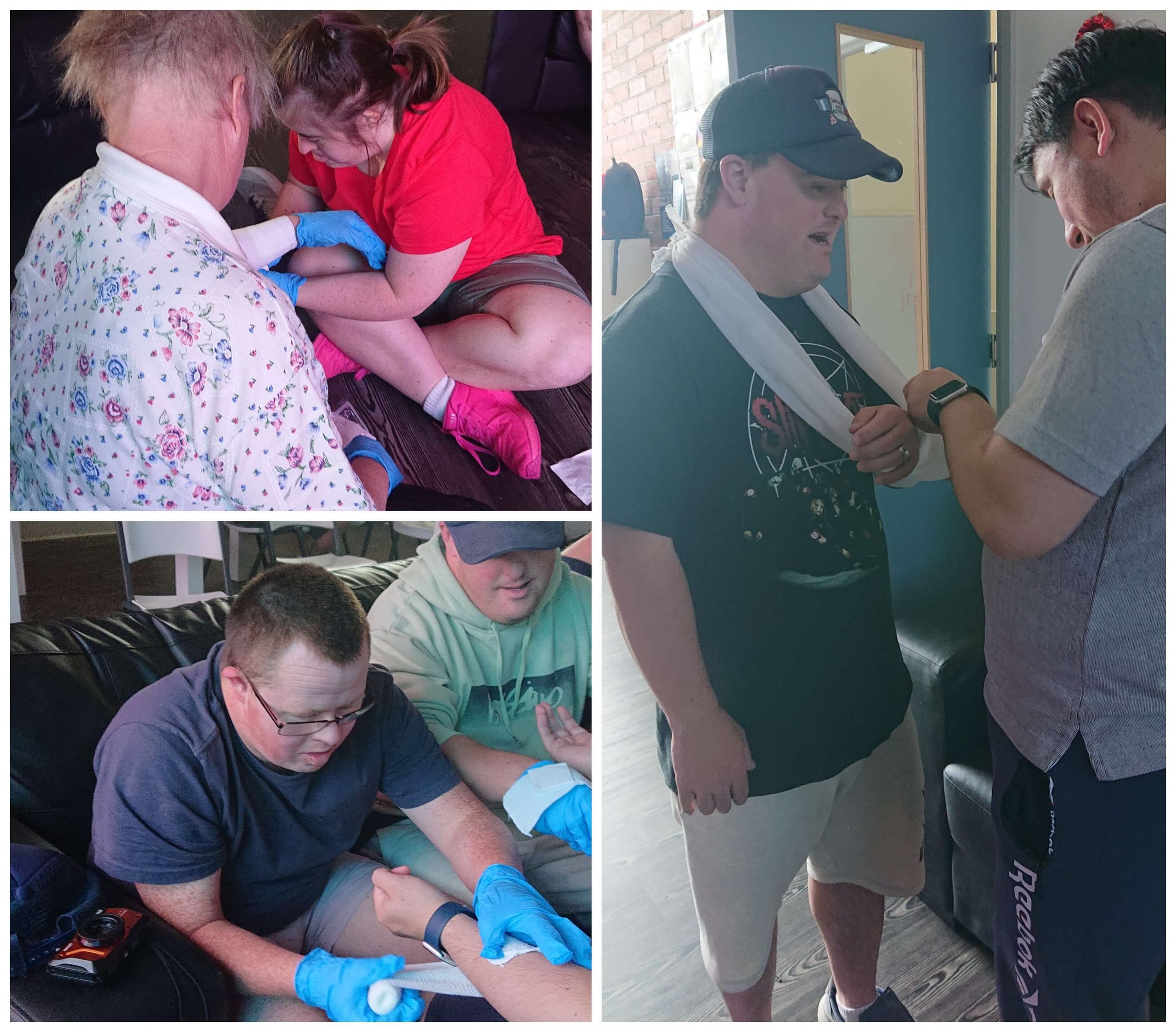 Image Description: a collage of three photos, from left to right; a photo of Chloe and Karen sitting on the floor. Chloe is wrapping Karen’s hands in a bandage. The second photo is of Jack sitting next to Josh on a black couch. Jack is wrapping someone’s hands in a bandage. He is wearing blue gloves. They are both wearing blue gloves. The third image is of Josh wearing a sling. A person is helping Josh wear the sling.