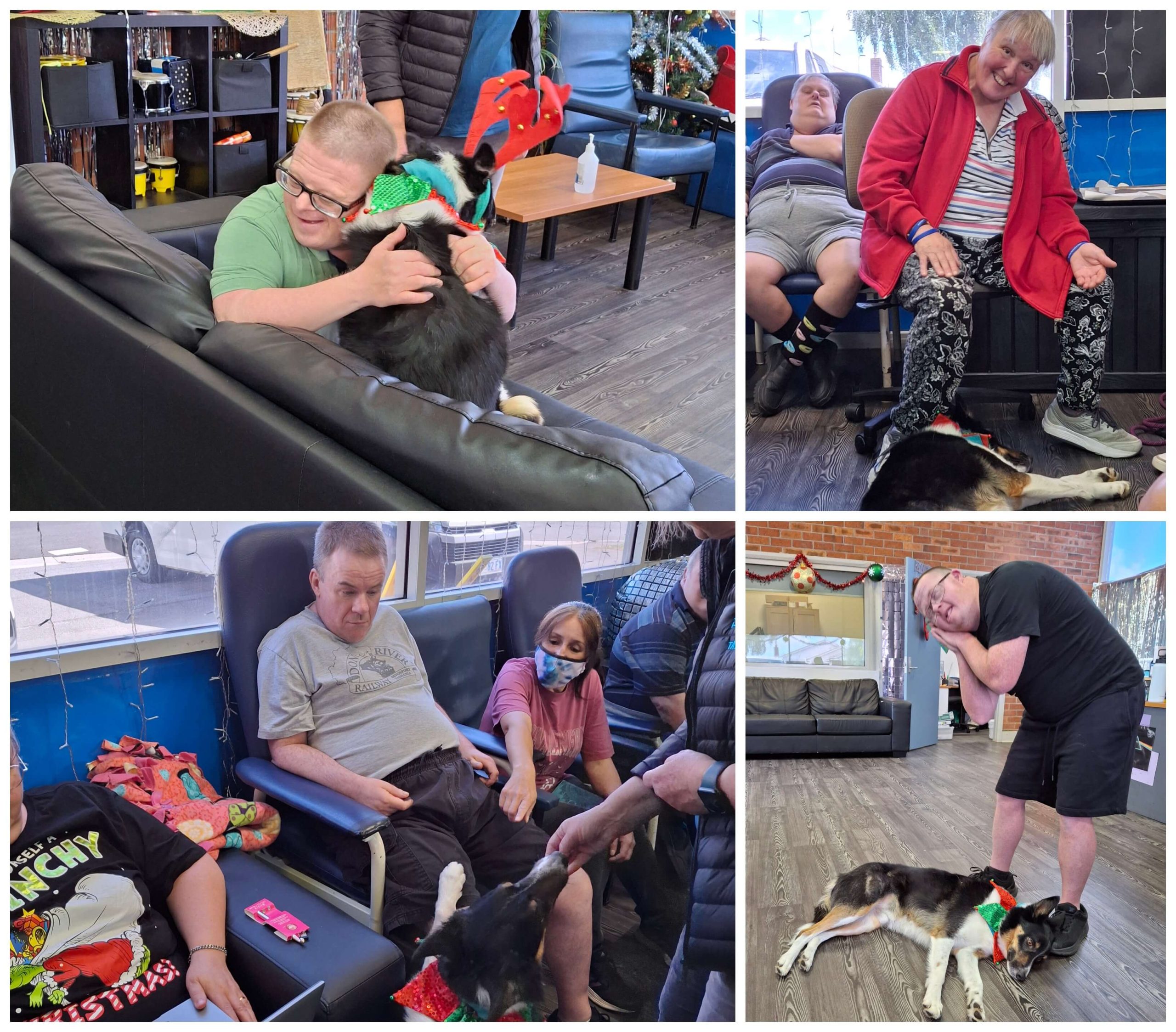 Image Description: a collage of four photos, from left to right; a Paul hugging the black, white and brown therapy dog on a black leather couch. The dog is wearing Christmas collar. A photo of Karen smiling as she sits over the dog that is sleeping on the floor. A photo of Jack standing over the dog that is asleep on the floor. Jack has his hands tucked under his head to show he is sleeping. A photo of Drew seated next to two staff members. In front of him, the therapy dog is seated in front of him.