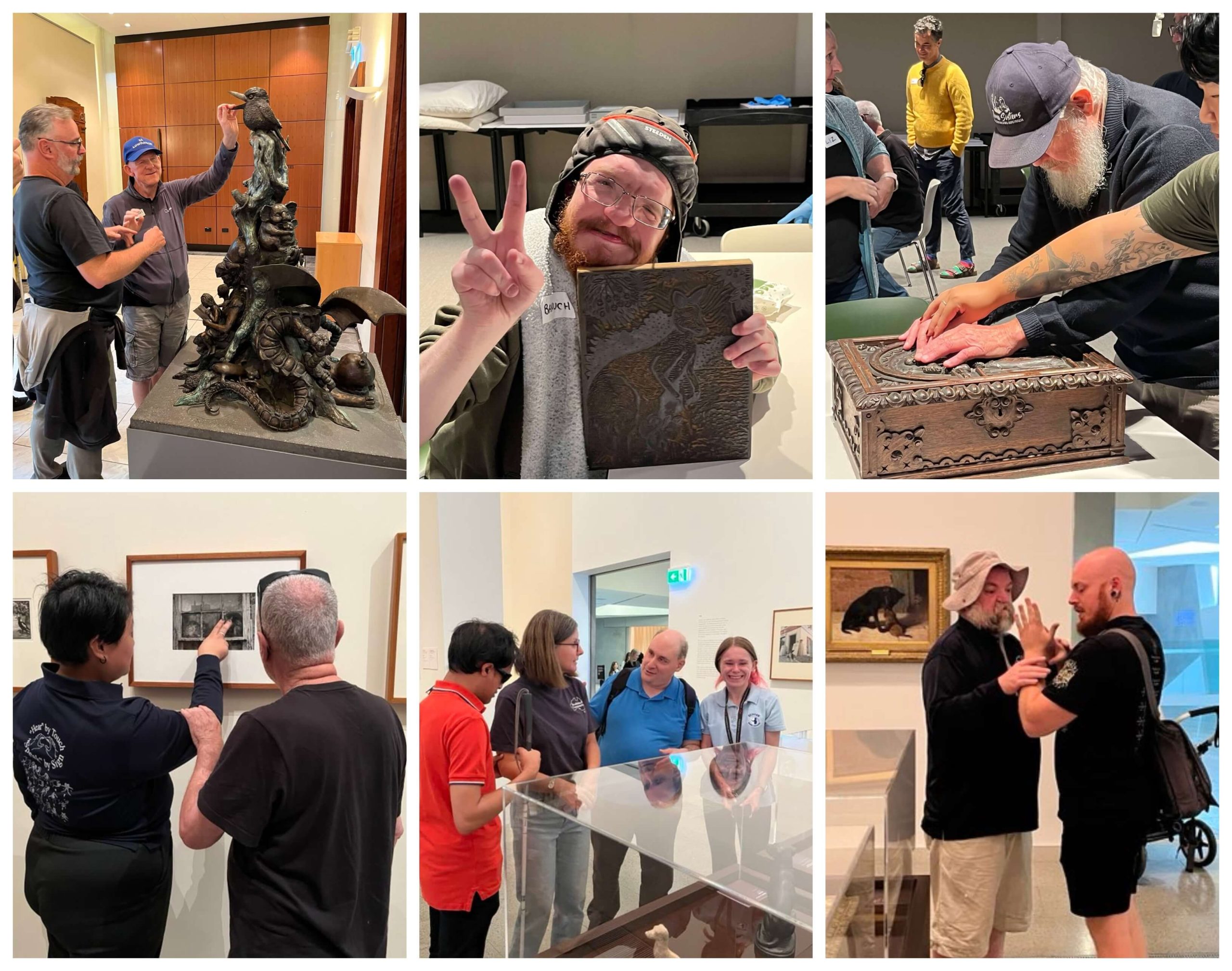Image Description: (photos left to right) a photo of Michael smiling as he reaches up to touch a statue of creatures surrounding a tree trunk. Next to Michael stands his Comm Guide. A photo of Baruch smiling and holding up the peace sign as he holds up an artifact at the library. He is wearing a khaki long sleeve top, glasses and a padded helmet. A photo of Richard touching a large wooden box that is decoratively carved. He is wearing a navy cap and a navy knit sweater. A photo of Stan and his Comm Guide facing a piece of artwork on the wall. The Comm Guide is pointing at the artwork and Stan is holding the Comm Guides arm. A photo is of Alex, Mark, a Comm Guide and a Museum staff member facing a glass display cabinet at the exhibit. A photo of Rodney communicating with his Comm Guide using tactile sign language. They are standing in the exhibit. Behind them is art on the wall and next to them is a glass display cabinet.